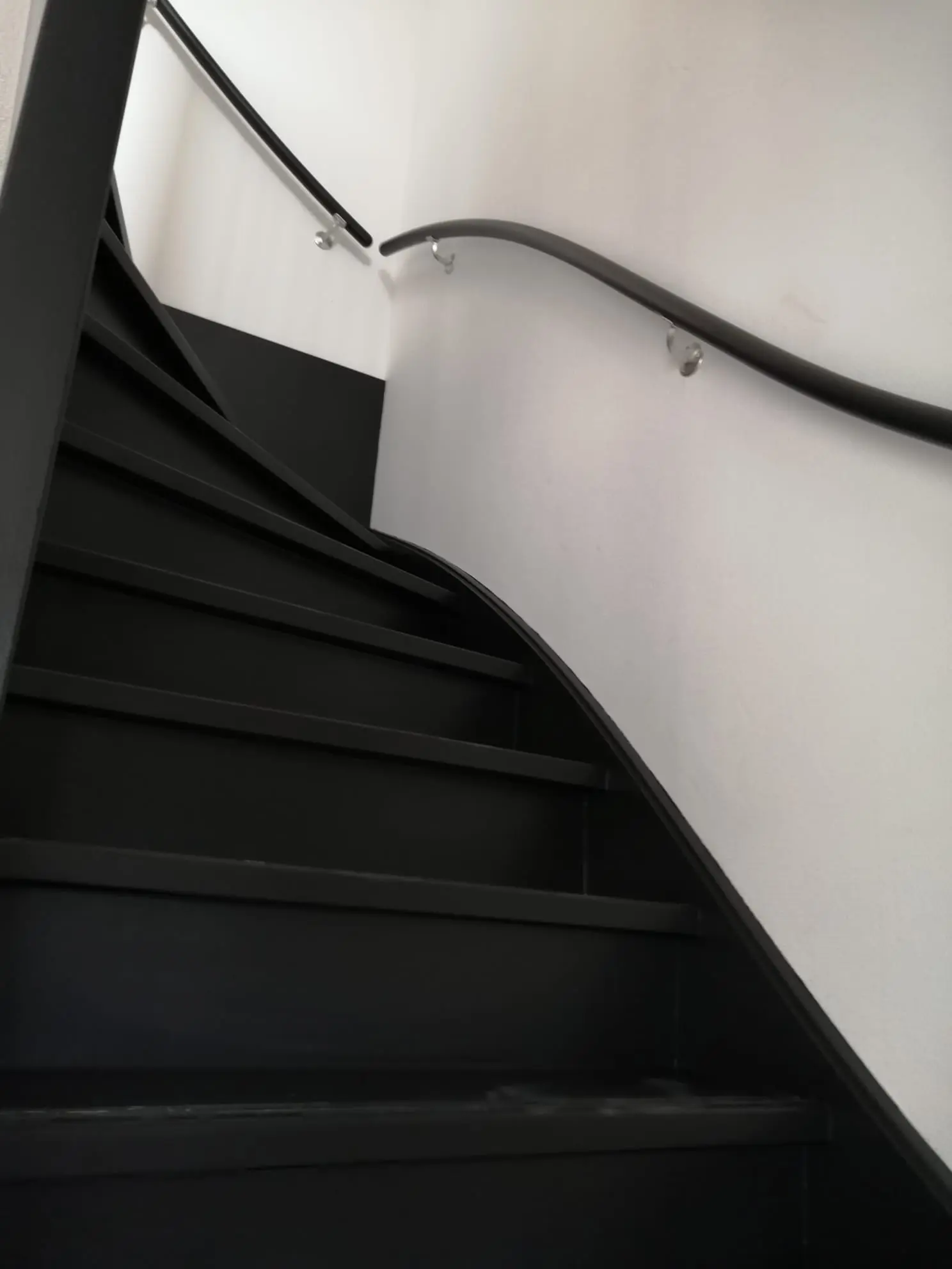 Kantoortrap gerenoveerd en afgelakt voor een luxe en duurzame afwerking. Kantoortrap gerenoveerd met vliesbehang voor een strakke en professionele afwerking. Zwart gelakte trap en witte renovlies behang in een kantoorruimte voor een moderne en elegante afwerking. Gerenoveerd kantoor met fris kozijnschilderwerk voor een professionele uitstraling.